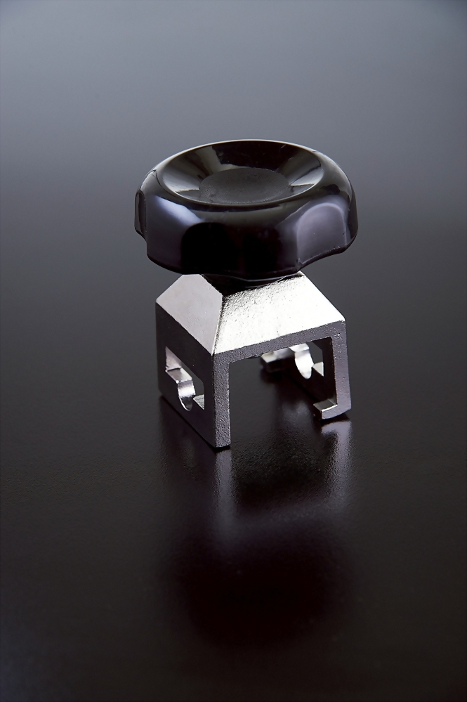 方形固定器為醫療設備用固定配件,採方形金屬結構設計,上方配置旋鈕式固定件。