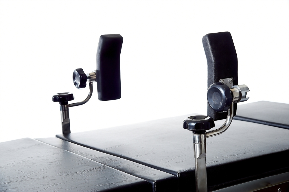 可調式腰架為醫療手術台或醫療工作台用之支撐配件,外觀由軟墊支撐面與金屬調整支架組成,並配置旋鈕式調整結構。