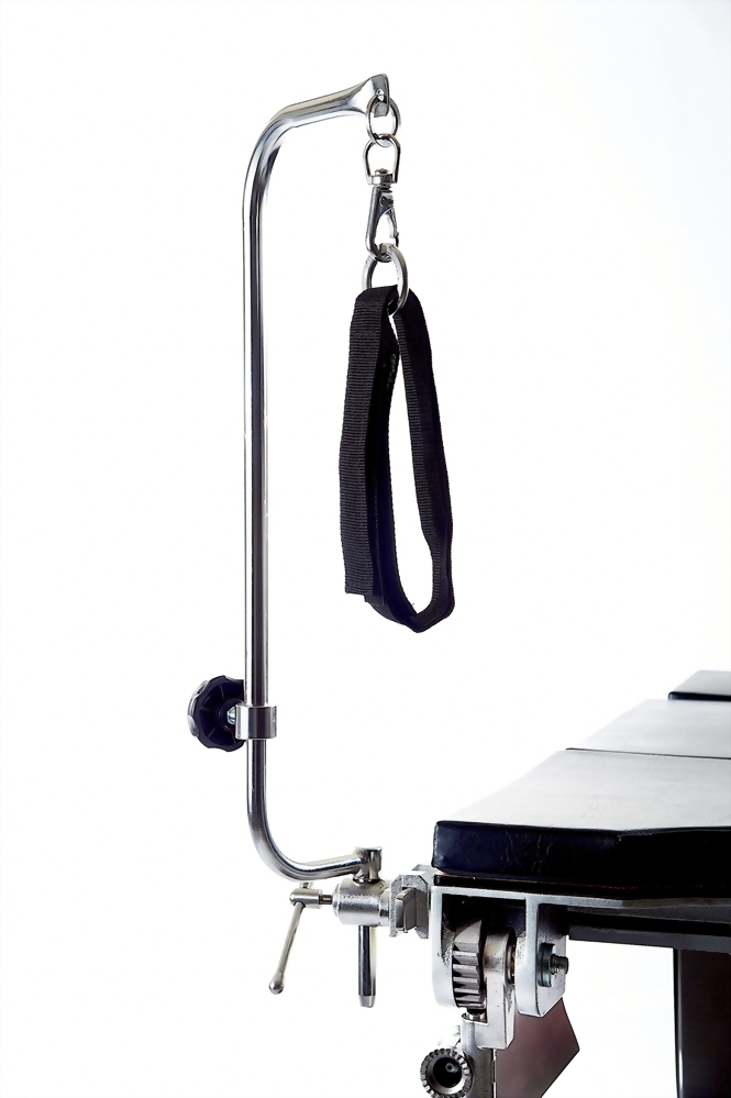 截石位吊腳架為醫療設備用之支撐配件,外觀由金屬支架結構、懸掛式吊環與束帶配置組成,並搭配旋鈕式固定結構。